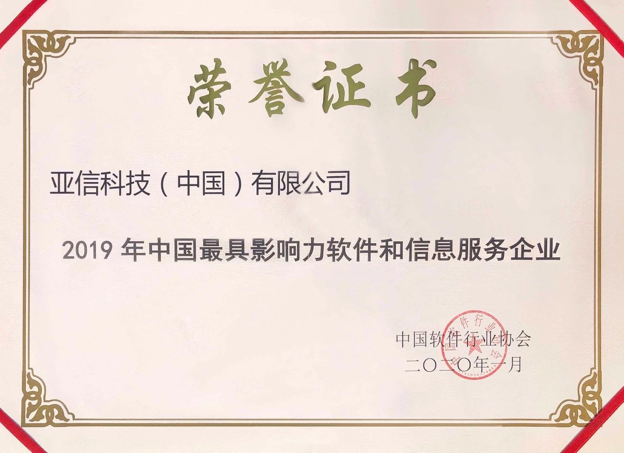 2020年1月 304am永利集团荣获“2019年中国最具影响力软件和信息服务企业”